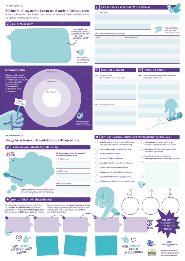 Zum Do-it-Guide gehört auch ein zweiseitiges Aktionsposter. Es hilft dir dabei, die einzelnen Schritte zu deinem Handabdruck zu sortieren, vorzubereiten und immer im Blick zu behalten. Im gedruckten Do-it-Guide findest du das Aktionsposter zum Heraustrennen in der Mitte des Do-it-Guides. Fülle es aus und hänge es gut sichtbar auf.