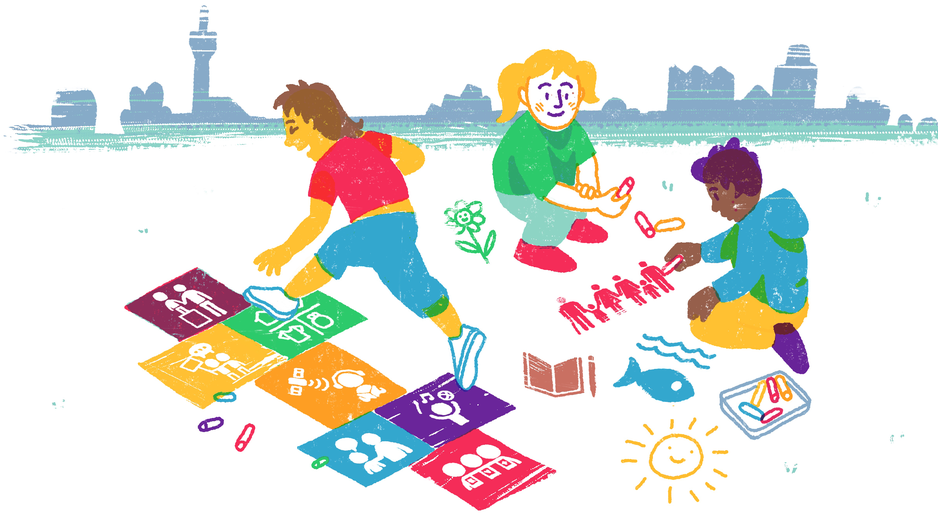 Der Falter Kinderrechte der Bundeszentrale für politische Bildung präsentiert auf der Vorderseite ein Wimmelbild, auf dem Kinder die Themen der Kinderrechtsartikel entdecken können. Auf der Rückseite sind die Artikel der Konvention in kindgerechter Sprache so platziert, dass sie den Illustrationen des Wimmelbildes zugeordnet werden können.